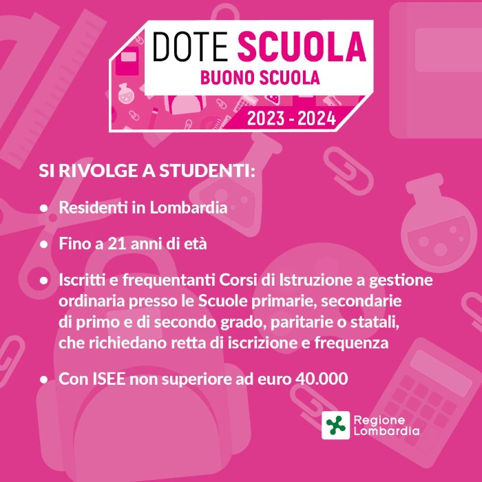 Possono beneficiarne gli studenti residenti in Lombardia, iscritti e frequentanti Corsi di Istruzione a gestione ordinaria presso le scuole primarie, secondarie di primo e di secondo grado. Gli istituti devono prevedere una retta di iscrizione e frequenza e avere sede in Lombardia, o nelle regioni confinanti, purché lo studente rientri quotidianamente alla propria residenza.