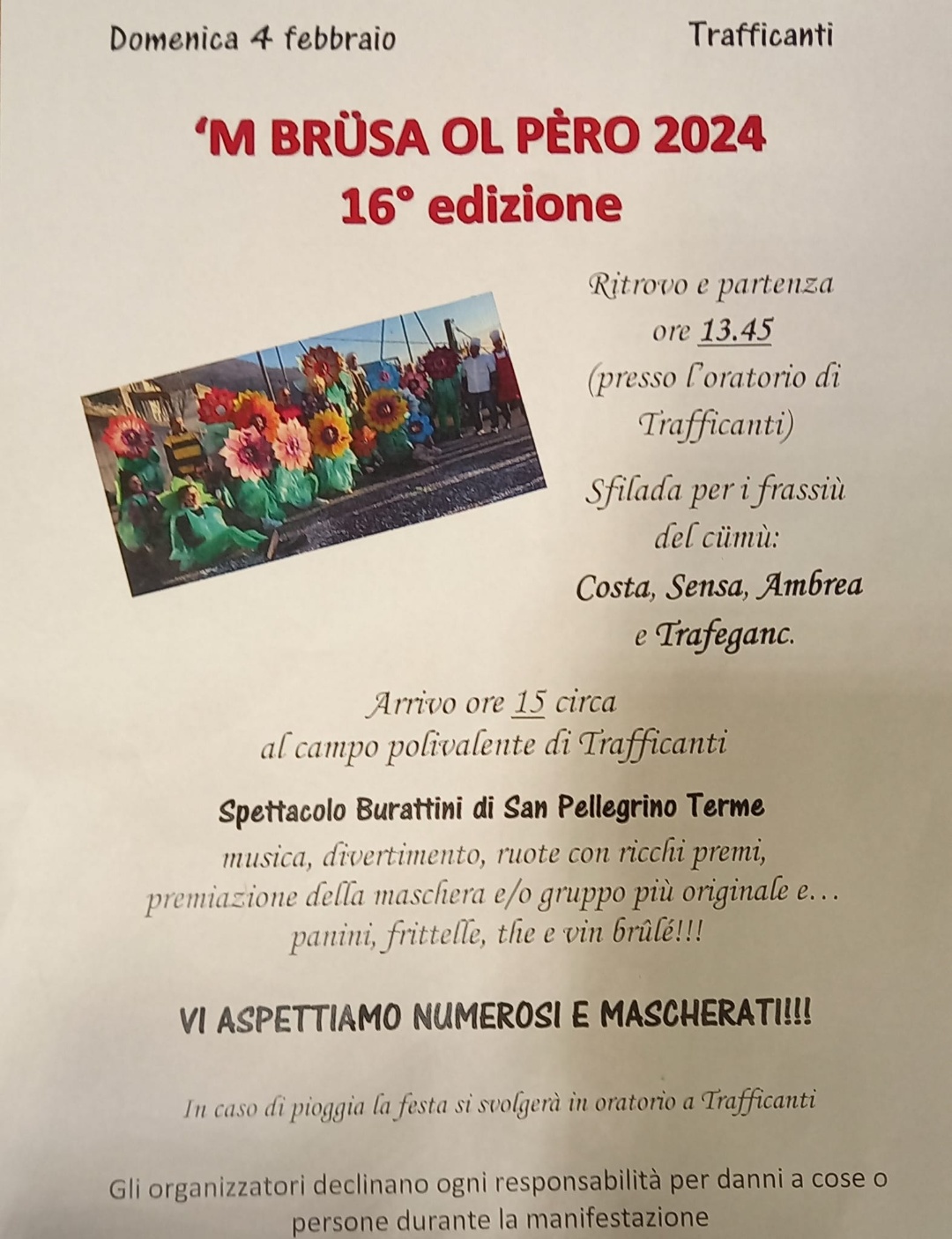 Ritrovo e partenza presso l'oratorio di Trafficanti alle 13:45 e arrivo al polivalente di Trafficanti alle 15:00 circa, seguito dallo spettacolo dei burattini di San Pellegrino Terme e tanto altro divertimento!