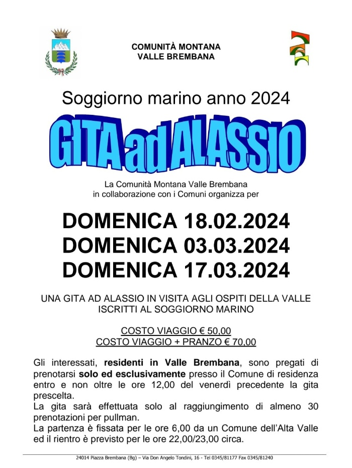Mentre per la gita pasquale dal 30 marzo al 1° aprile 2024, riservata ai residenti in Valle Brembana che hanno compiuto 60 anni, gli interessati, sono pregati di prenotarsi solo ed esclusivamente presso il Comune di residenza entro e non oltre le ore 12,00 del 18.03.2024 .