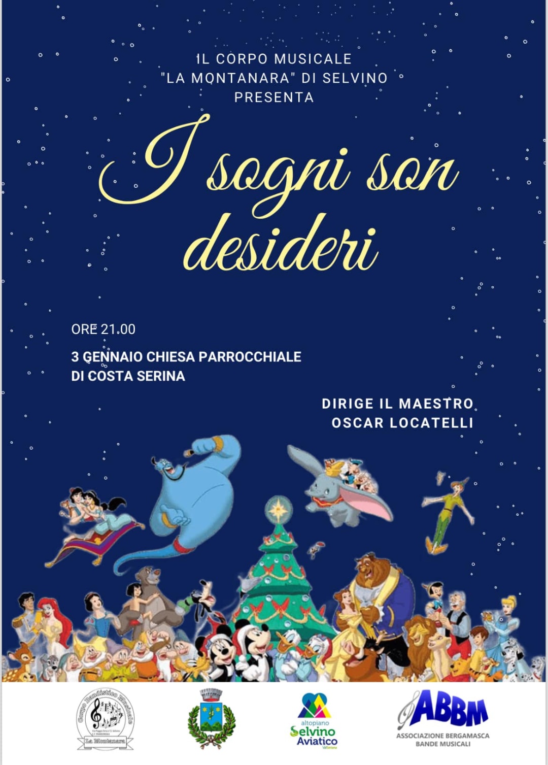 IL corpo musicale "La Montanara" di Selvino presenta "I sogni son desideri" alle ore 21:00, mercoledì 3 gennaio, presso la chiesa parrocchiale di Costa Serina.